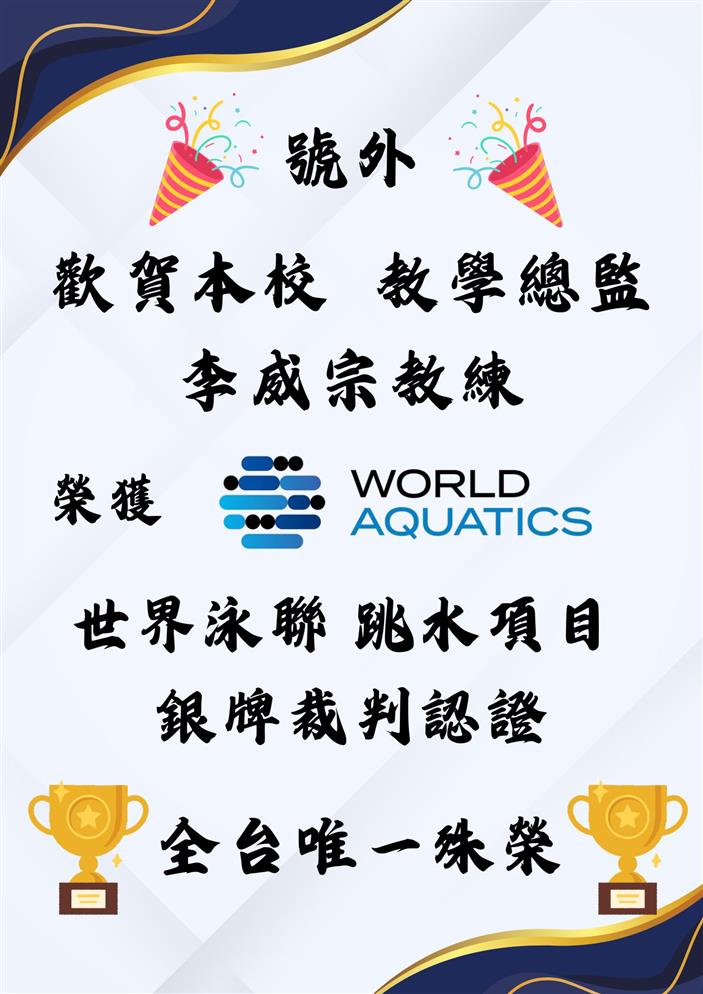 🎉🎉號外🥳🥳歡賀 本校教學總監 李威宗總教練榮獲世界水上運動總會👉跳水項目 銀牌裁判認證👈🏆全台唯一殊榮🏆🔍小科普:世界水上運動總會(World Aquatics),又稱世界泳總,是負責管理游泳類水上運動的國際體育組織,受國際奧林匹克委員會承認。1908年成立於英國倫敦,總部設在瑞士洛桑。國際游泳總會所管理的運動項目包括游泳、跳水、花式游泳、水球、公開水域游泳。世界泳總網站名單👉https://www.worldaquatics.com/diving/officials